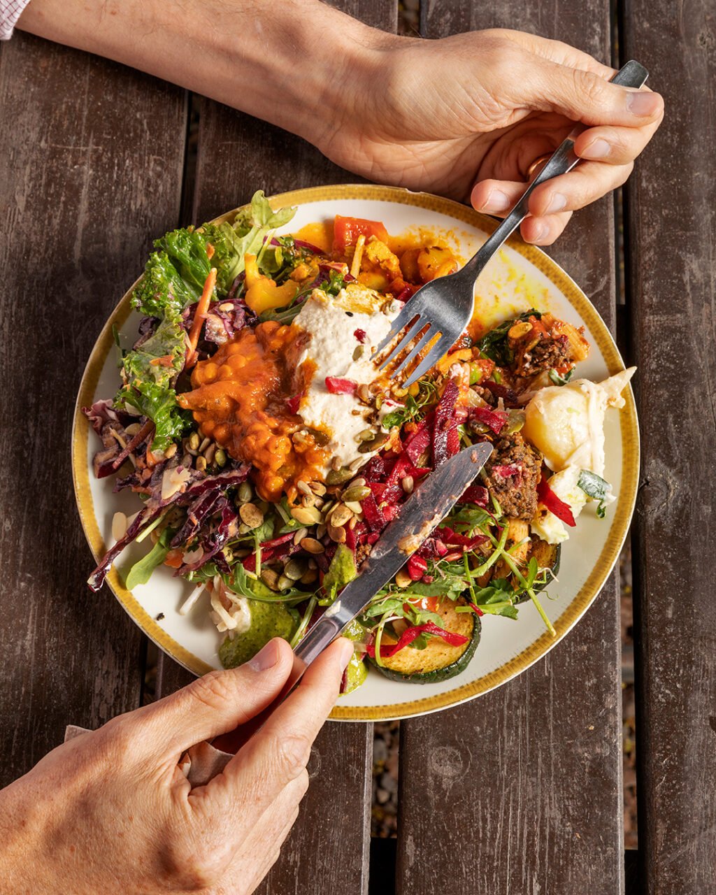 Vi har stämt träff på Hermans restaurang på Fjällgatan i Stockholm. Lunchbuffén är vegansk och David Stenholtz plockar på sig på ett rejält lass av vegansk lasagne, indisk linsgryta, picklade grönsaker, färska sallader, hummus, olivtapenade och rostade frön.
