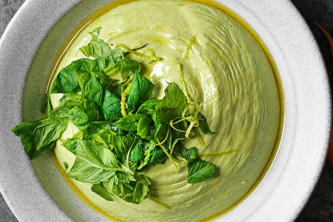 - Fyll med fördel upp i en spritspåse. Förvara kallt till servering, toppa med färsk mynta, citronzest och olivolja.