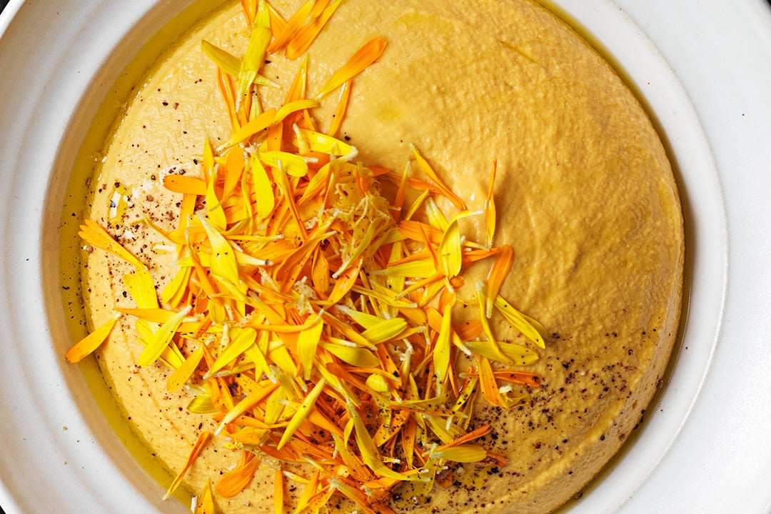 - Fyll upp i en spritspåse och förvara kallt till servering. Toppa med till exempel ringblommor, sumac och olivolja.