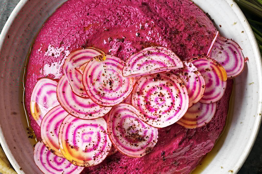 - Garnera med tunt hyvlade betor, olivolja och sumac eller svartpeppar.