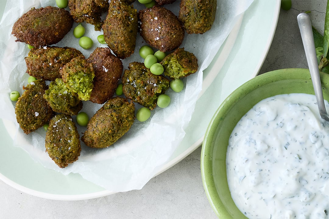 - Plocka kryddörterna och pressa citronen. Mixa till en grov massa tillsammans med kikärterna och ärterna. Vänd ner kryddor, bakpulver och vetemjöl, och låt blandningen vila i kylen i minst 30 minuter.
