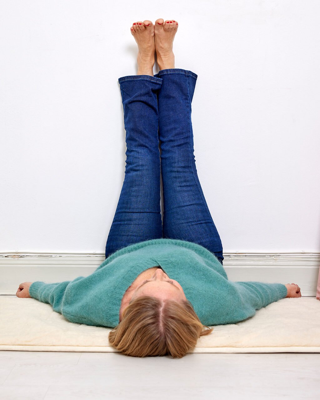 Gör så här: Lägg dig på rygg med benen upp mot väggen. Se till att rumpan har kontakt med väggen och att din överkropp är rak. Låt händerna vila på magen, så att du kan känna din andning. Förläng nacken genom att pressa ned hakan mot bröstkorgen. Slappna av i rygg, huvud, nacke och axlar. Slut dina ögon och följ med i din andning. Så här kan du ligga så länge som det känns bra för dig.