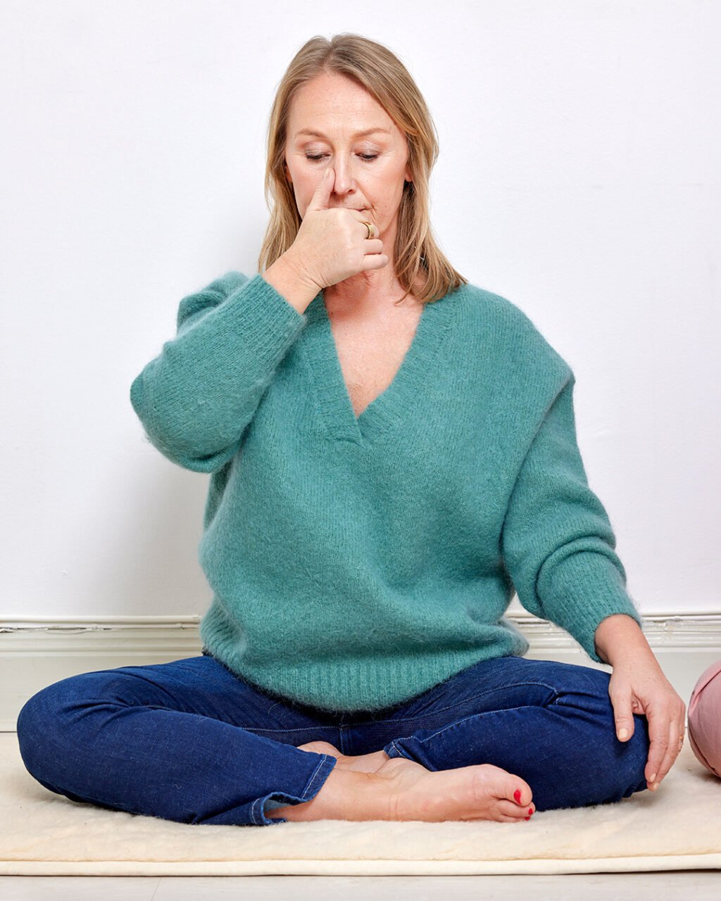 Gör så här: Sätt dig tillrätta, så bekvämt som möjligt. Kanske sitter du på en stol eller i skräddarställning. Låt andetagen komma och gå en liten stund. Du andas med näsan och munnen är stängd. Lyft höger hand och täpp till höger näsborre med höger tumme. Låt armbågen hänga fritt och avspänt. Andas in genom vänster näsborre. Ta ner handen och andas ut genom båda näsborrarna. Ta upp handen och täpp till höger näsborre med höger tumme och andas in genom vänster näsborre. Ta ner handen och andas ut genom båda näsborrarna.