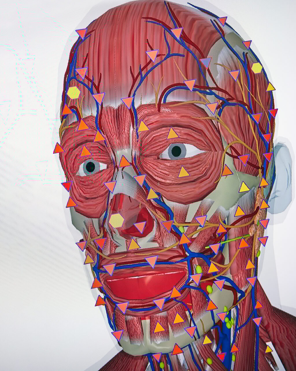 Jag lutar mig tillbaka i fåtöljen och tittar på en stor skärm på väggen medan frekvensmaskinen Metatron Hospital jobbar. Jag ser i realtid hur den tar sig igenom kroppsdel för kroppsdel, organ för organ. Röda, rosa och gula trianglar och cirklar far över de anatomiska bilderna.