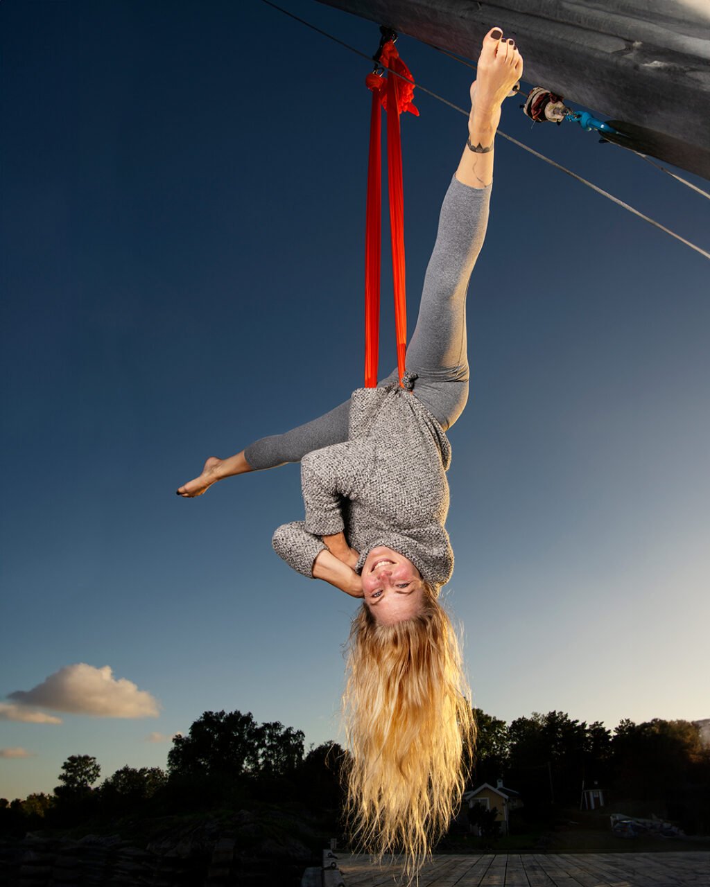 Det ser så enkelt och naturligt ut när Milla svävar i ett brandgult tygstycke några meter över havsytan. I själva verket var det fem år sedan hon pensionerade sig från jobbet som luftakrobat.