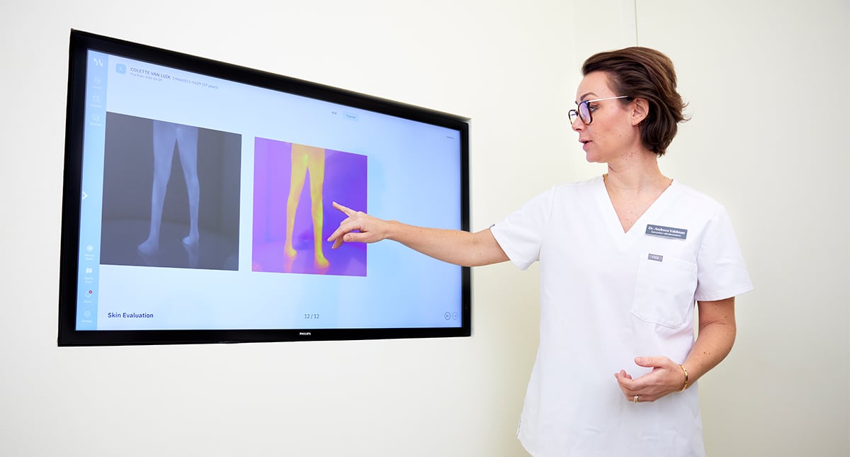 En automatisk röst berättar vad som ska ske och föreslår att jag ska blunda eftersom ljuset är väldigt starkt. Skanningen skapar en 3D- och en 2D-modell av mig och letar efter födelsemärken, utslag och åldersfläckar. Kroppsskanningen bygger på ett självlärande AI-system. Det hela är över på några minuter och sedan får jag sätta på mig morgonrocken igen.