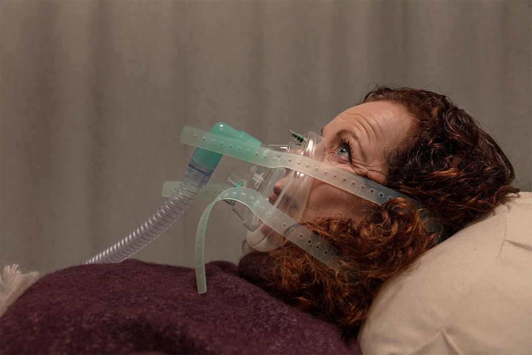 Mia erbjuder mig att prova och jag får ligga ner i en bekväm behandlingsstol. Hon sätter fast en mask som sluter tätt över mun och näsa och uppmuntrar mig att andas precis som vanligt. På fingret får jag en pulsoximeter.
