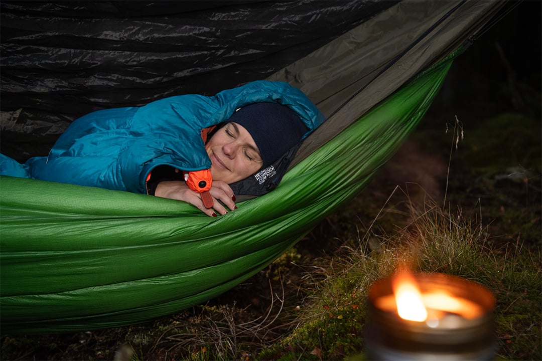 Skymningen har redan börjat sänka sig i granskogsgläntan, som Linda valt ut till sin sovplats för natten. Hon fäster sin hammock i två träd och placerar sina saker i en bestämd ordning så att hon vet var allt finns om hon till exempel behöver gå upp och kissa under natten.