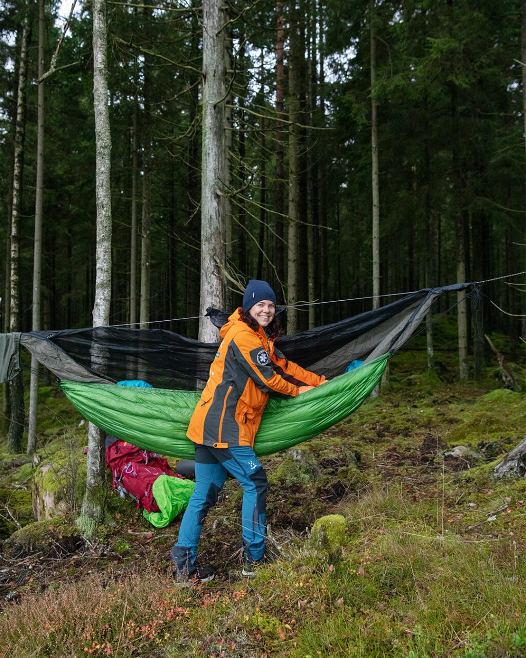 — Det är livskvalitet på riktigt, säger Linda som tagit av sig den varma jackan och nu motionerar lite lätt på stället för att få upp värmen innan hon kryper ner i sin hängande sovsäck någon halvmeter ovanför mossan.