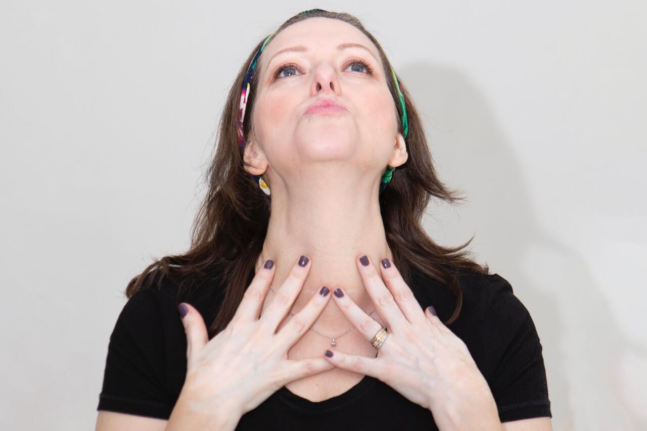Luta nacken försiktigt bakåt och pussa med munnen upp i luften. Gör cirka 50 pussar upp till skyn. Du kan hålla med händerna på halsen för att känna motståndet och musklerna bättre.