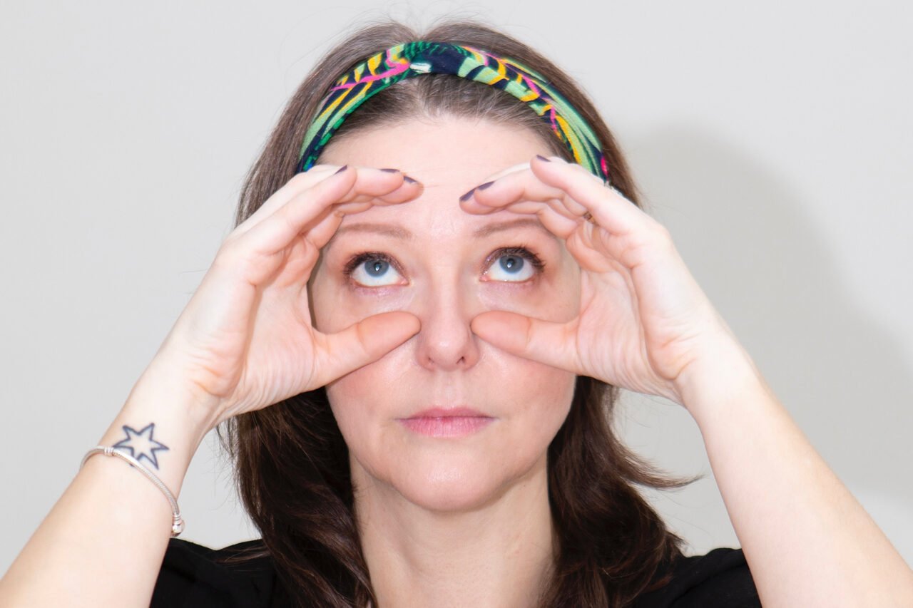 Låtsas att du håller som en kikare runt ögonen, dra ner pekfingret mot ögonbrynet samtidigt som du försöker höja ögonbrynen så det blir ett motstånd. Spärra upp ögonen eller titta upp, och räkna till 10. Här jobbar du med musklerna i pannan och även ögonen. Sänk axlarna och glöm inte att andas. Upprepa två gånger.