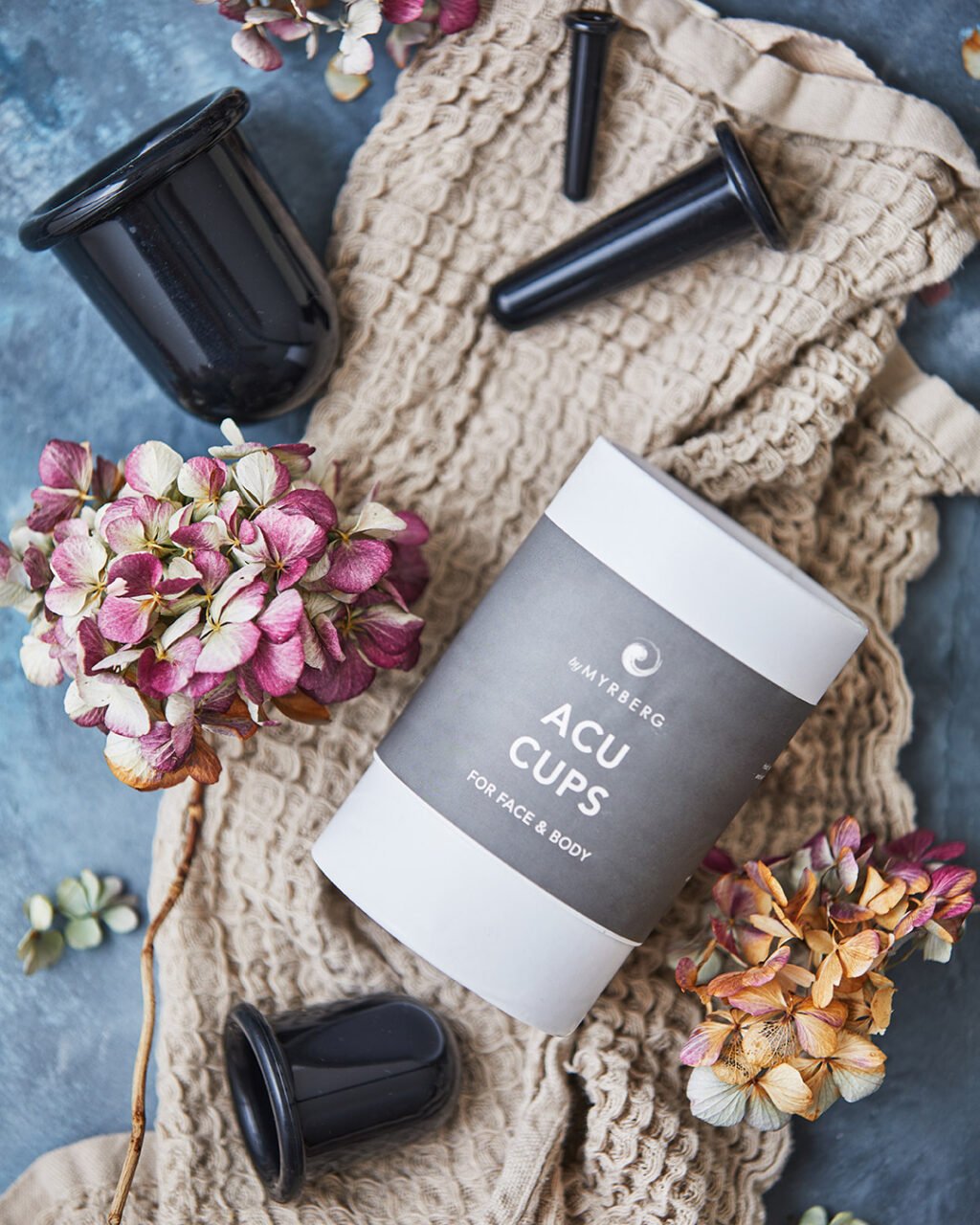 — Jag är akupunktör i grunden och där använder man sig av koppning, men då har man glaskoppor som sitter fast på ryggen. För att få resultat krävs kontinuitet, därför har jag tillverkat egna koppar, Acu Cups, med tillhörande olja i fyra aromadofter. Du kan enkelt använda dem på dig själv hemma eller prova vår professionella Aroma Cupping på utvalda spa — en holistisk och djup terapeutisk upplevelse, som ger både smärtlindring, aromaterapi, bindvävsmassage, ansiktslyft och lymfdränage.