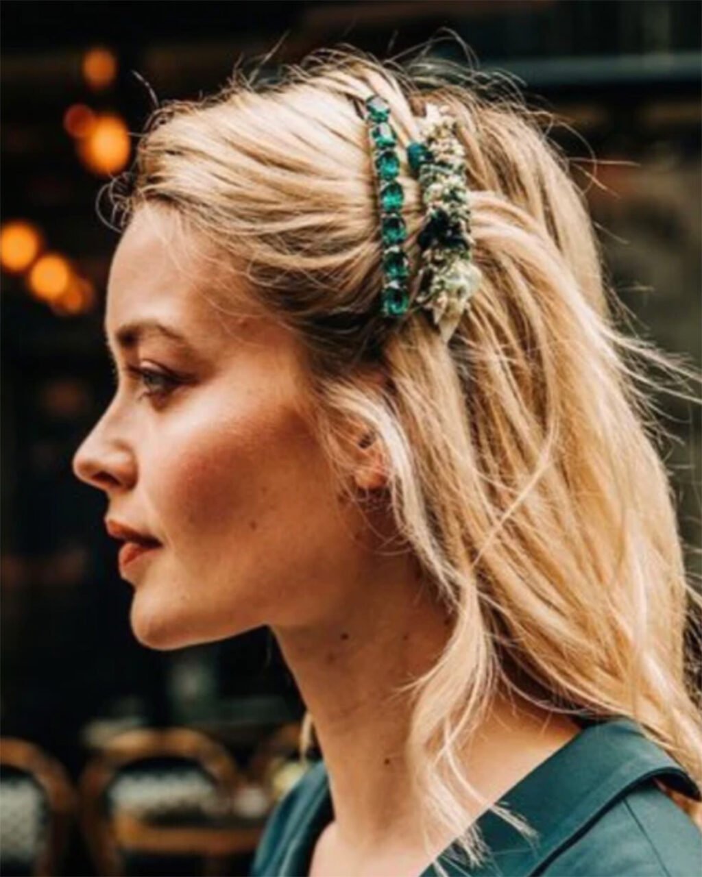 — Bananklämman är tillbaka — ett glammigt komplement till den vanliga hårklämman. Perfekt för att fästa upp ett lockat hår för en festligare touch. Sidbenan blir ännu starkare under 2025, vilket gör att både spännen och mer avancerade hårsmycken dyker upp. En annan spaning är att detta öppnar upp för fler örhängen som sticker ut — de behöver inte vara stora utan snarare unika och framhävas tillsammans med frisyren.