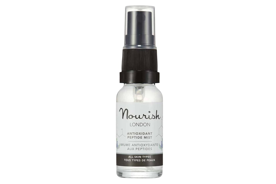 Jag använder alltid en uppfriskande mist under dagen som skyddar mot skadliga effekter av skärmljus. Här finns det flera att välja mellan, en av mina favoriter är Antioxidant Peptide Mist från Nourish London. Fyll även på med vätska inifrån, gärna vatten naturligt smaksatt med det som finns hemma, ingefära, gurka, frysta hallon – det allra enklaste för din hudhälsa och lymfsystemet, 95 kr, eteritique.se