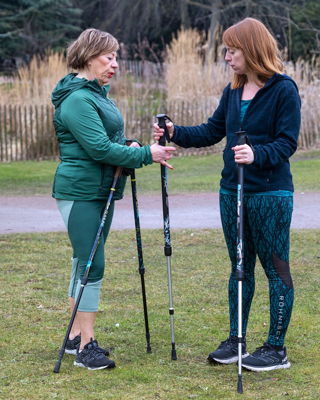 Be gärna om hjälp att ställa in stavarna i rätt höjd när du köper dem. De flesta stavar som säljs idag är justerbara i längden, så kallade ”teleskopstavar”, vilket gör att ni kan vara två som delar på dem i familjen. (Om ni inte vill gå samtidigt!)