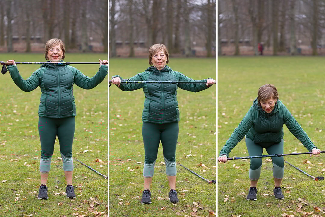 Håll staven framför dig och vrid handlederna framåt. Gör en knäböj och börja om.