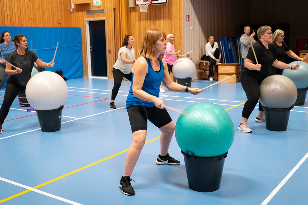Under passet slår man sedan med trumstockarna mot bollen, i takt med musiken, samtidigt som man utför olika konditions- och styrkeövningar. Lite dans, lite aerobics — och mycket flås!