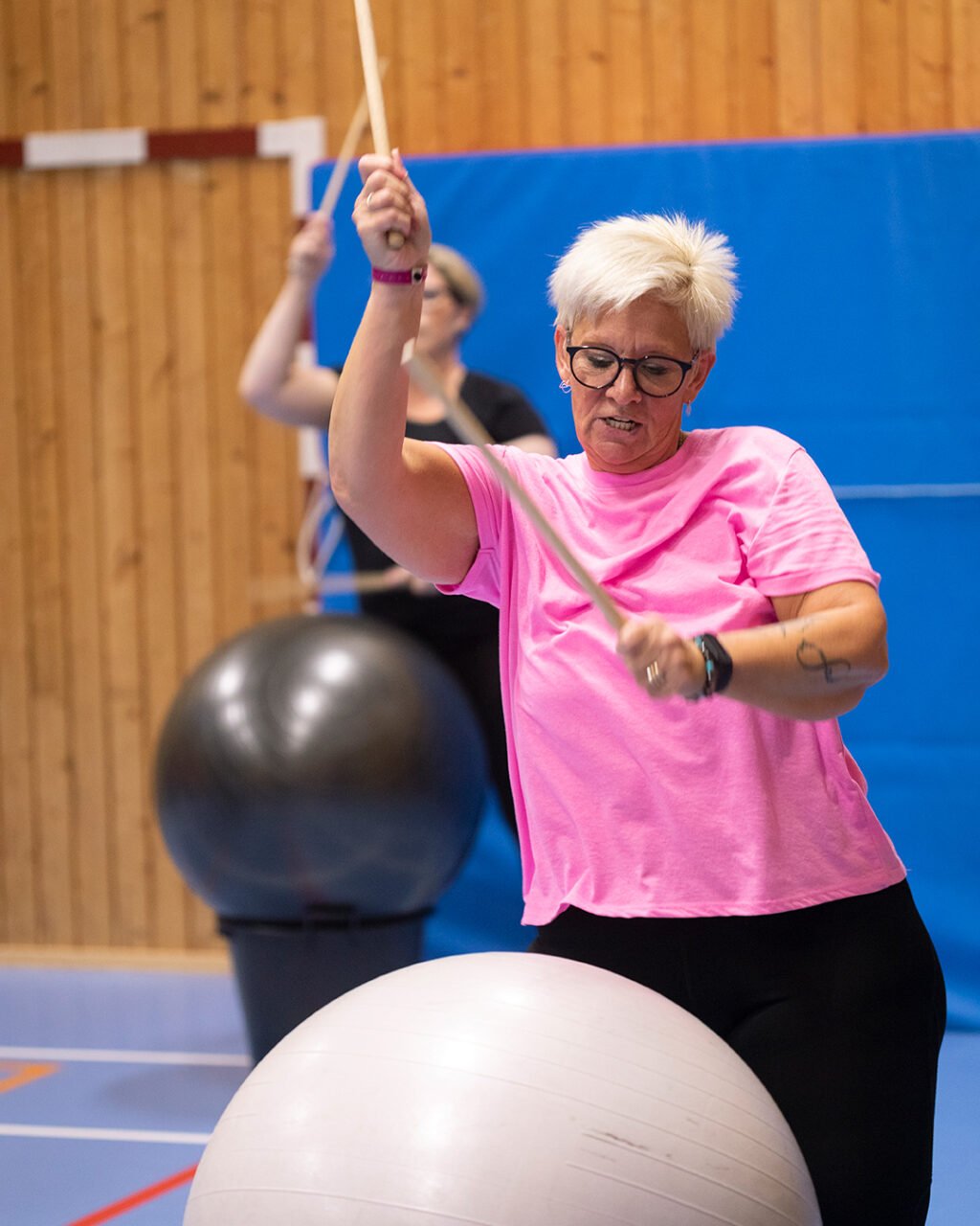 — Cardio drumming är verkligen en träningsform som passar alla! Du tränar utifrån dina egna förutsättningar och lägger rörelserna och intensiteten på en nivå som passar just dig. Vi har deltagare som är vältränade, men vi har också haft deltagare som min pappa. Han är en höftopererad 85-åring med pacemaker, som satt ner på en stol under passet — och hade jätteroligt!