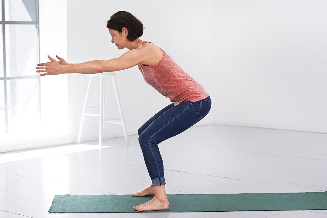 - Böj knäna samtidigt som du för fram armarna framför kroppen. Sjunk ner tills låren är vågräta. Res dig upp medan du låter armarna sjunka ner mot kroppen igen.