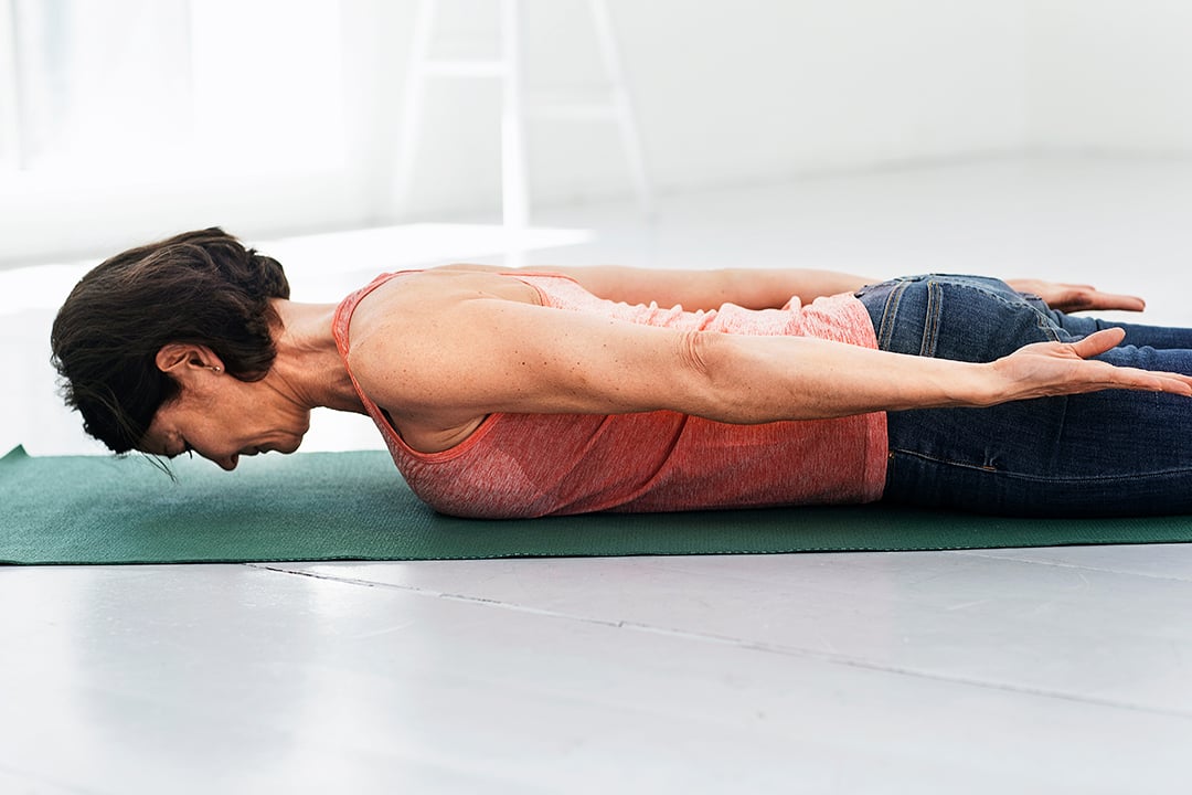 - Lägg dig på magen med armarna längs sidorna. Spänn skinkorna och lyft överkropp och armar en aning från golvet. Försök hålla rygg och nacke raka och undvik att pressa ner länden. Sänk kroppen igen och slappna av.
