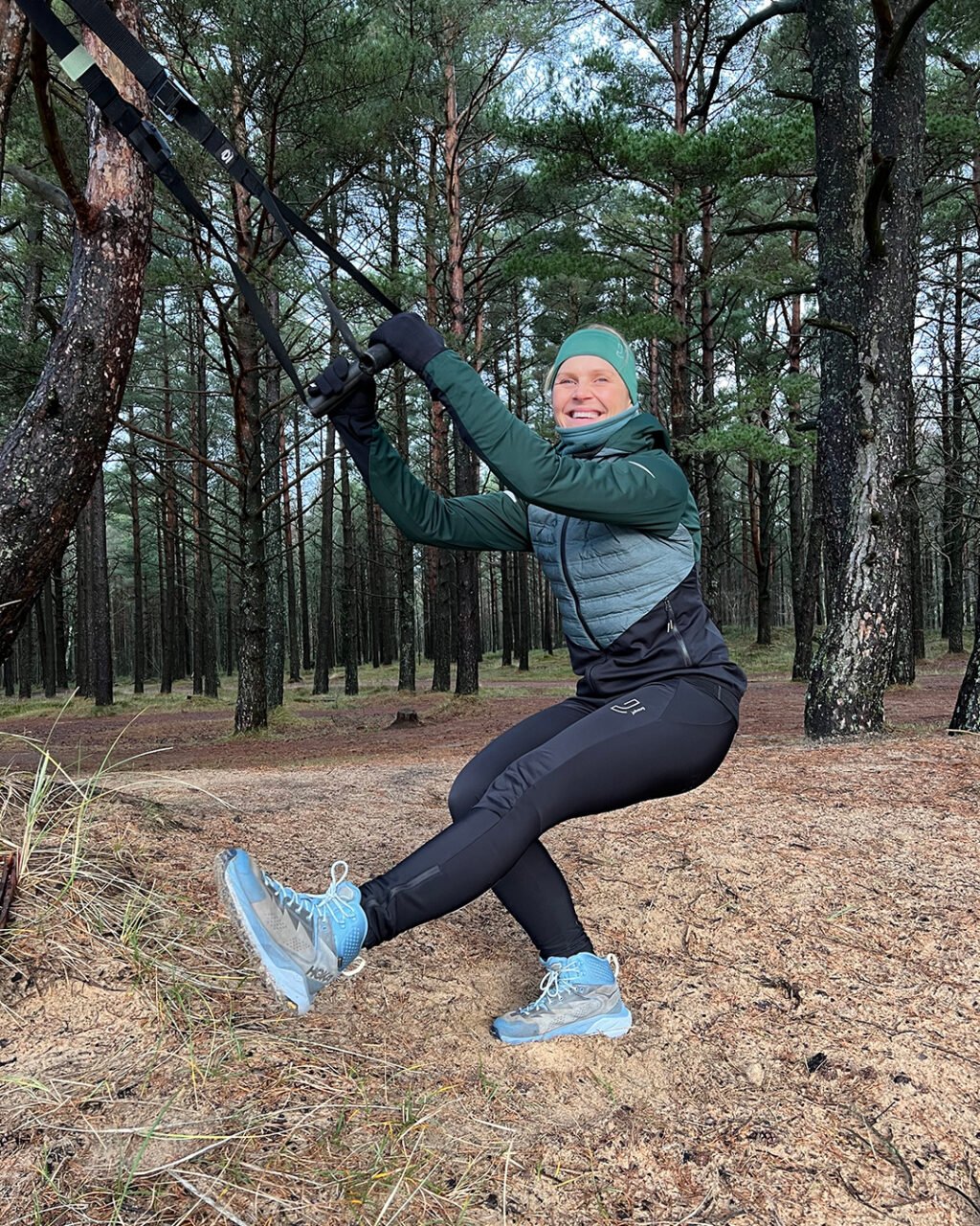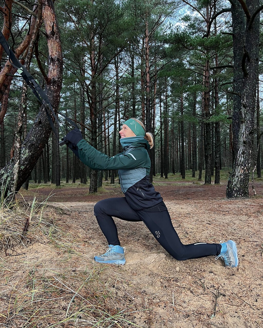 Träningsbandet kan fästas i ett träd, en dörr eller liknande. Se bara till att det sitter fast ordentligt. Är du superstark och vill ta träningen ännu ett steg längre, kan båda övningarna utföras utan träningsband.