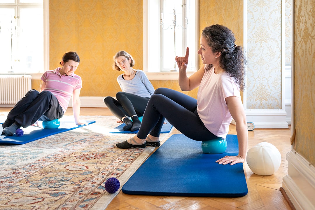 När du känner dig förtrogen med bollen och hur man använder den kan du börja jobba med den själv där hemma, menar Pamela. Du kan själv känna efter var du har ömma punkter i till exempel sätesmusklerna och så rullar du bollen i små cirklar där det känns bra.