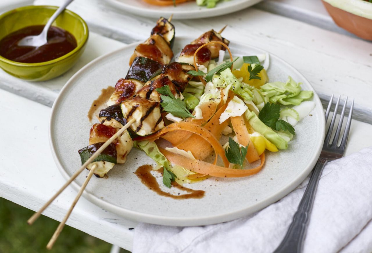 Recept: BBQ-spett med squash och halloumi