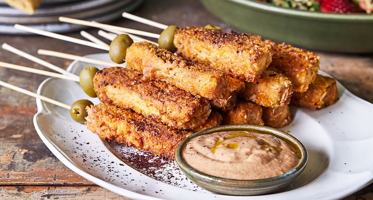 Krispiga rotfruktsfritters med citronsmakande tahinikräm